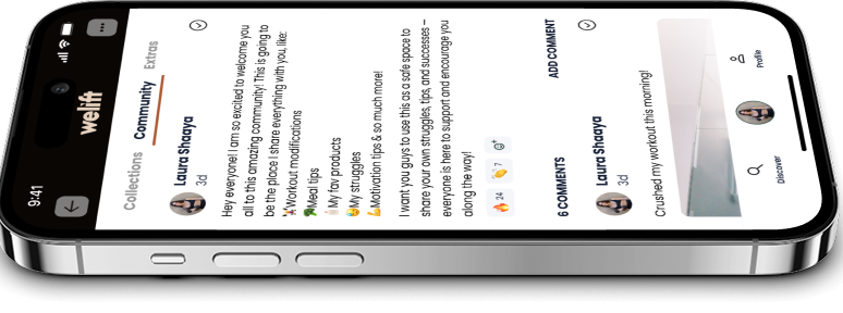 Inside WeLift, join a community of incredible women where you can ask questions, share your wins, and get direct support from me. Together, we'll stay motivated and celebrate wins as we work towards our goals!